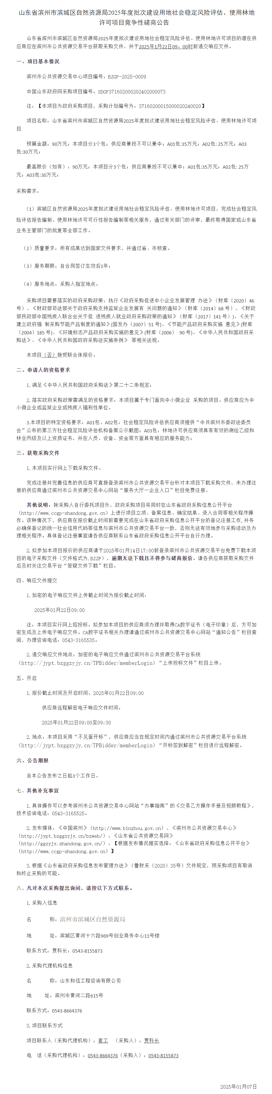 山东省滨州市滨城区自然资源局2025年度批次建设用地社会稳定风险评估、使用林地许可项目竞争性磋商公告
