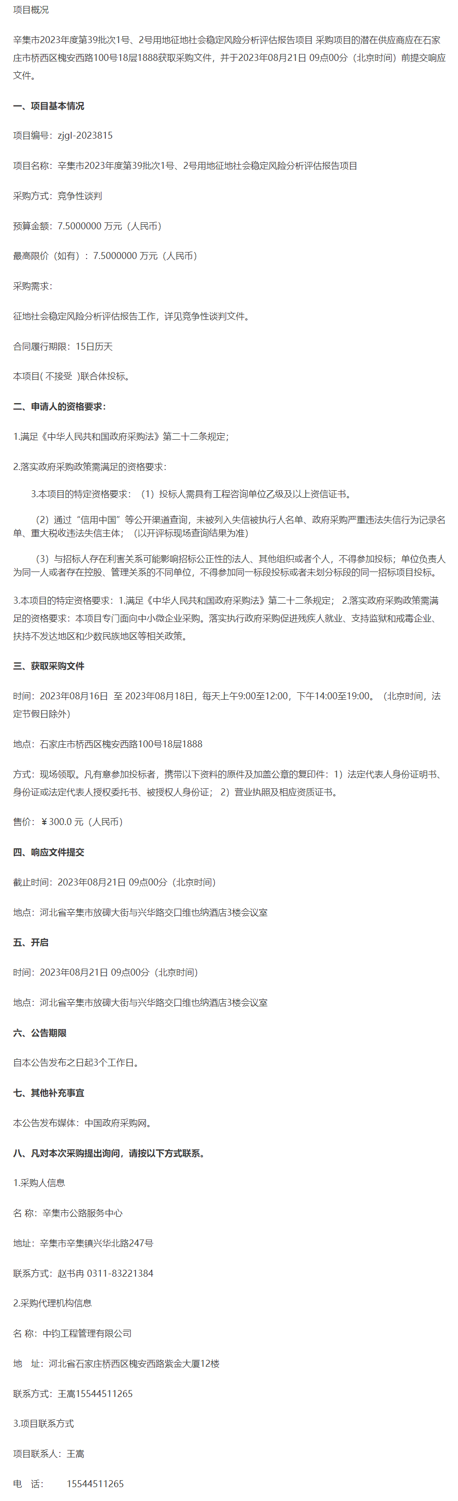 辛集市公路服务中心辛集市2023年度第39批次1号、2号用地征地社会稳定风险分析评估报告项目竞争性谈判公告