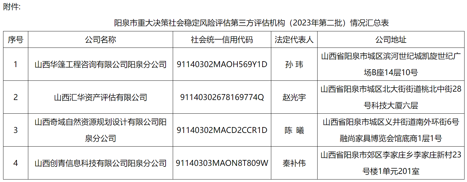 附件:阳泉市重大决策社会稳定风险评估第三方评估机构(2023年第二批)情况汇总表